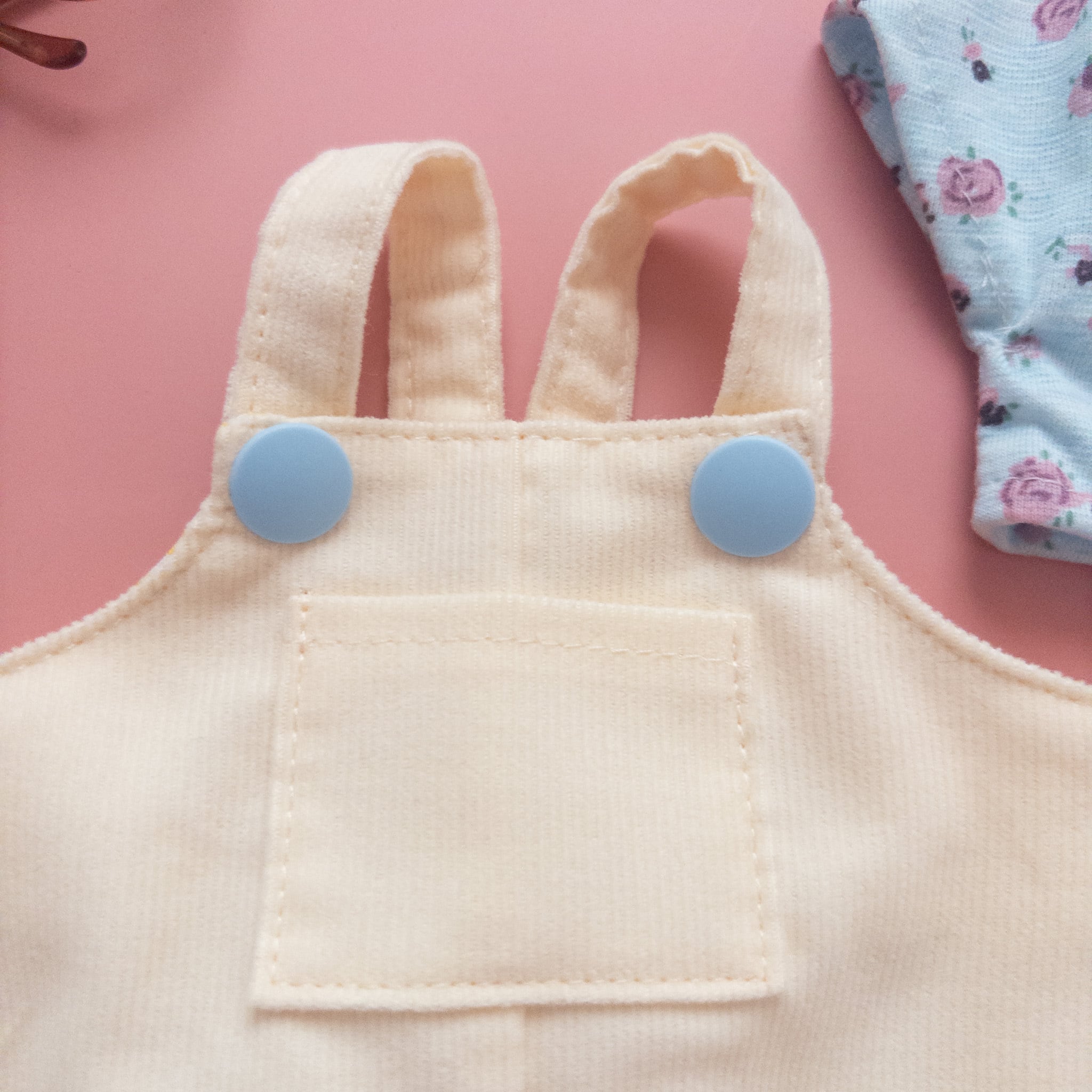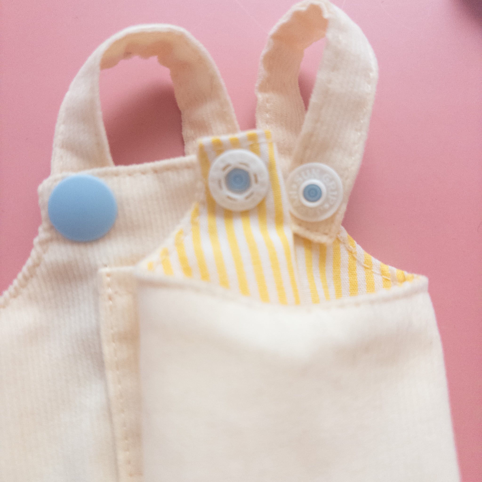 サロペットのボタンはプラスチックボタンを使っています。
