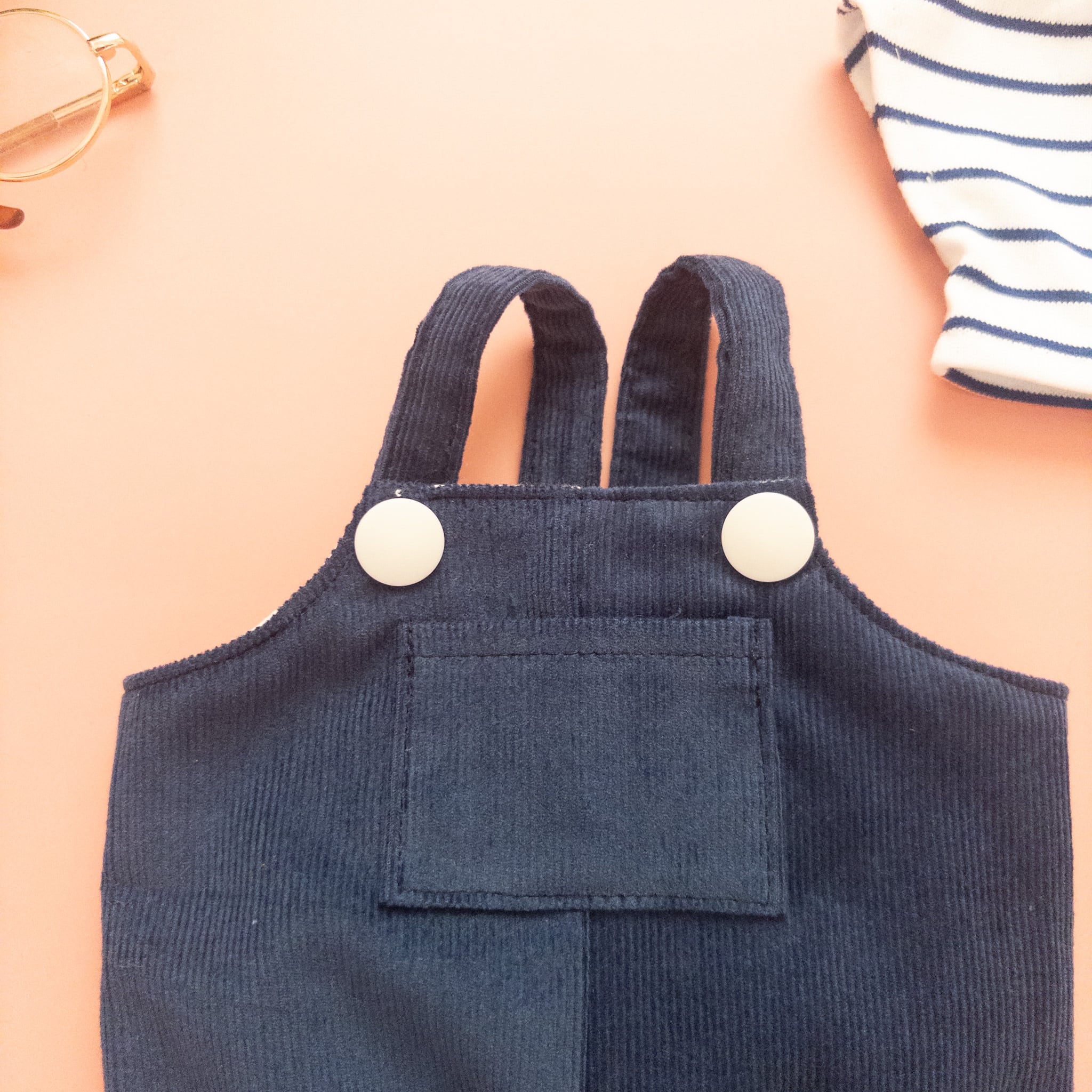 サロペットのボタンはプラスチックボタンを使っています。