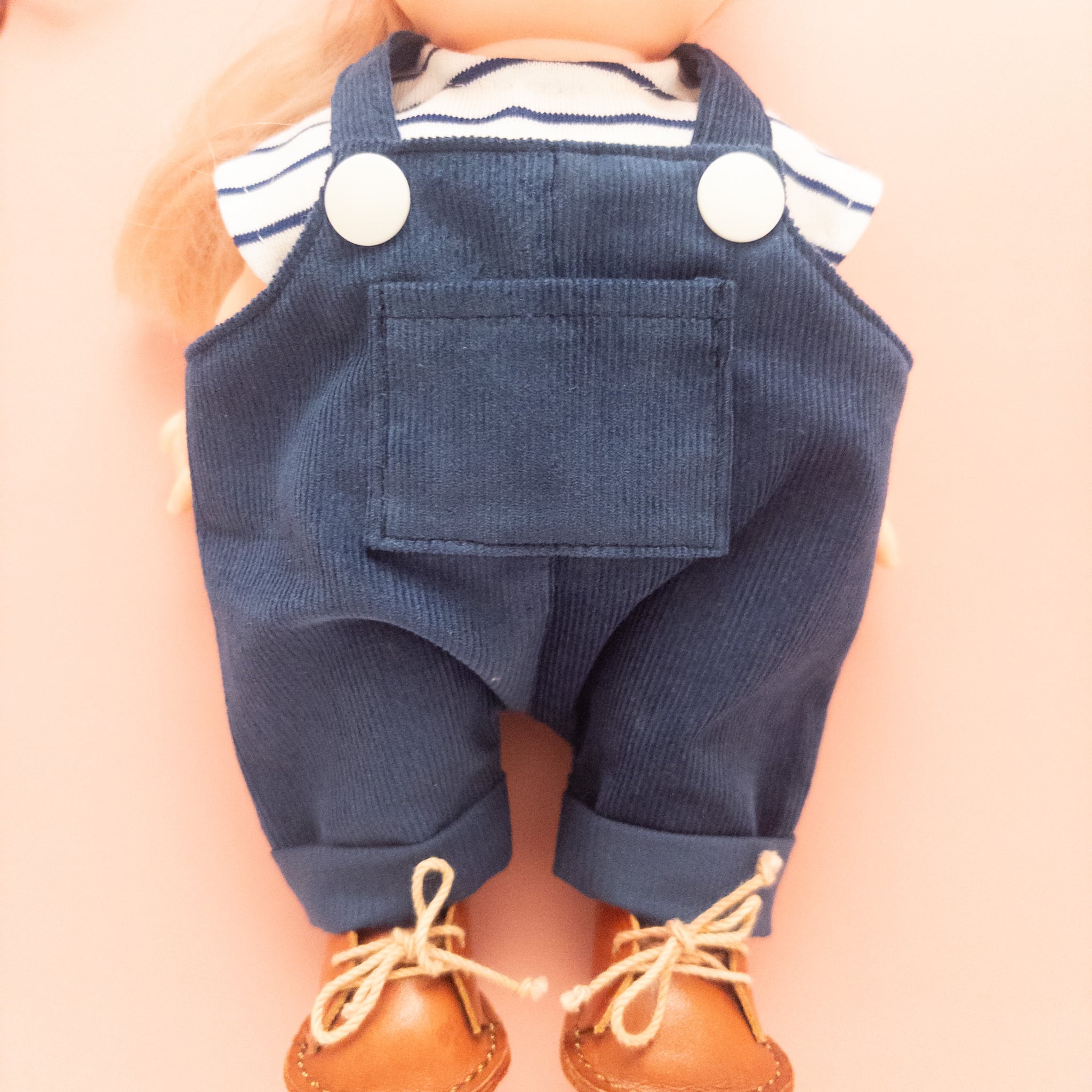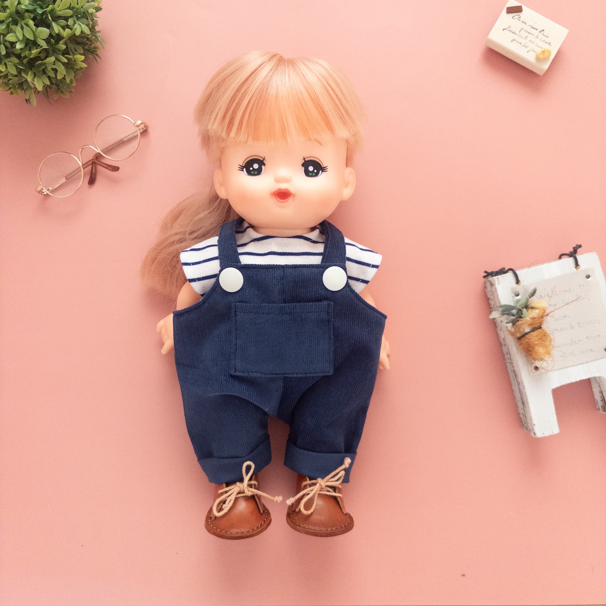 こちらメルちゃんソランちゃんサイズのトレーナーとサロペットの2点セットです。