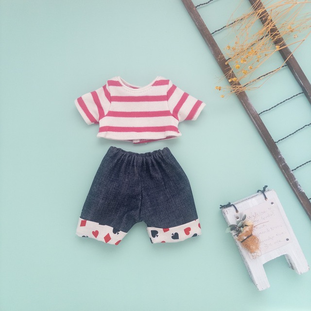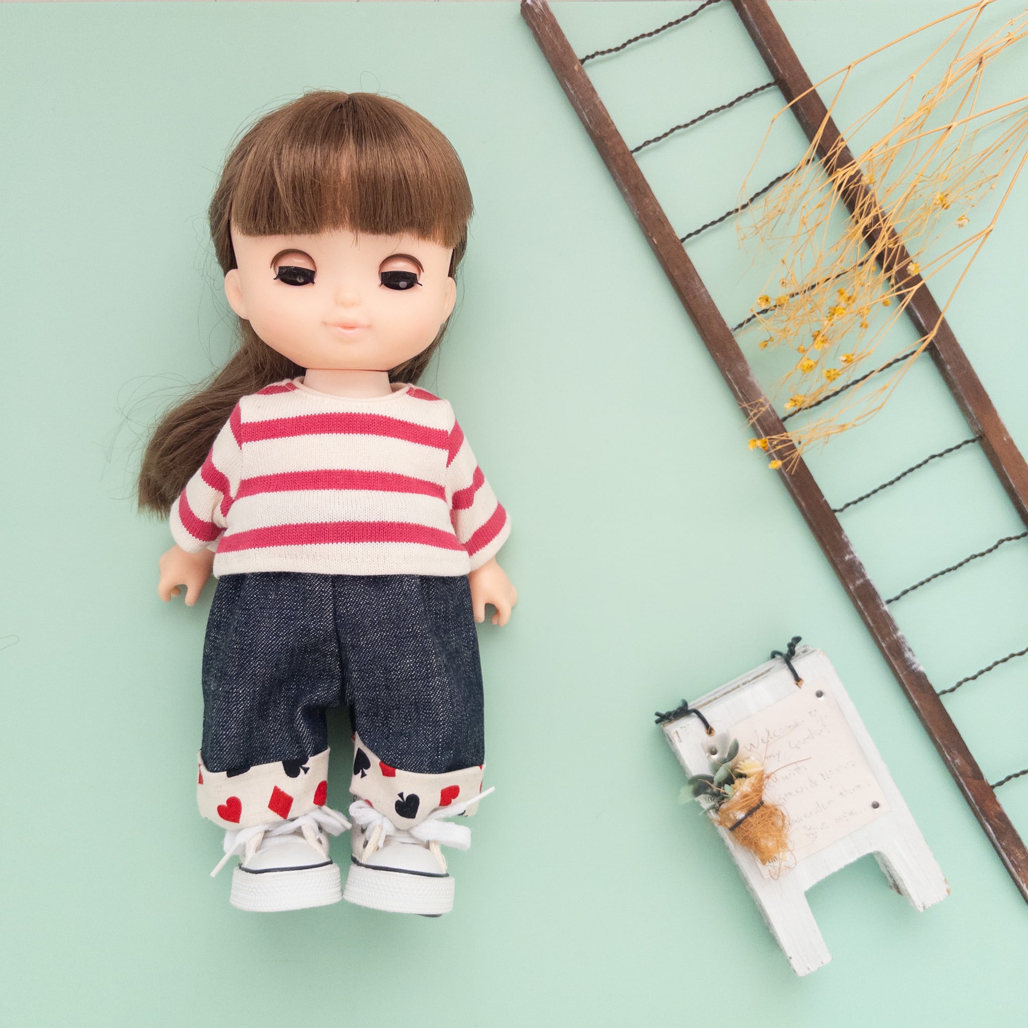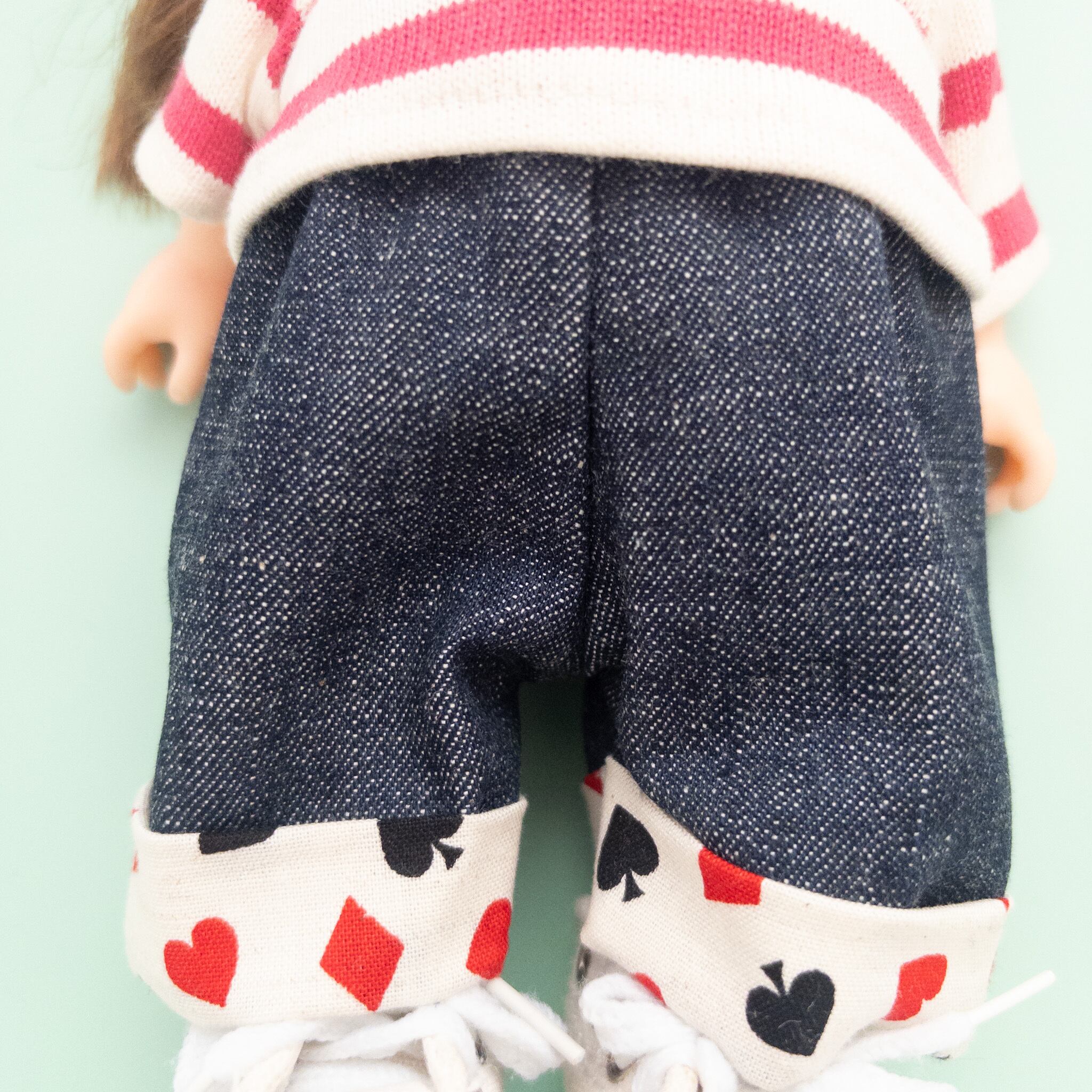 【2点セット】トレーナーロールアップジーンズセット(赤ストライプトランプ柄)メルちゃんソランちゃん