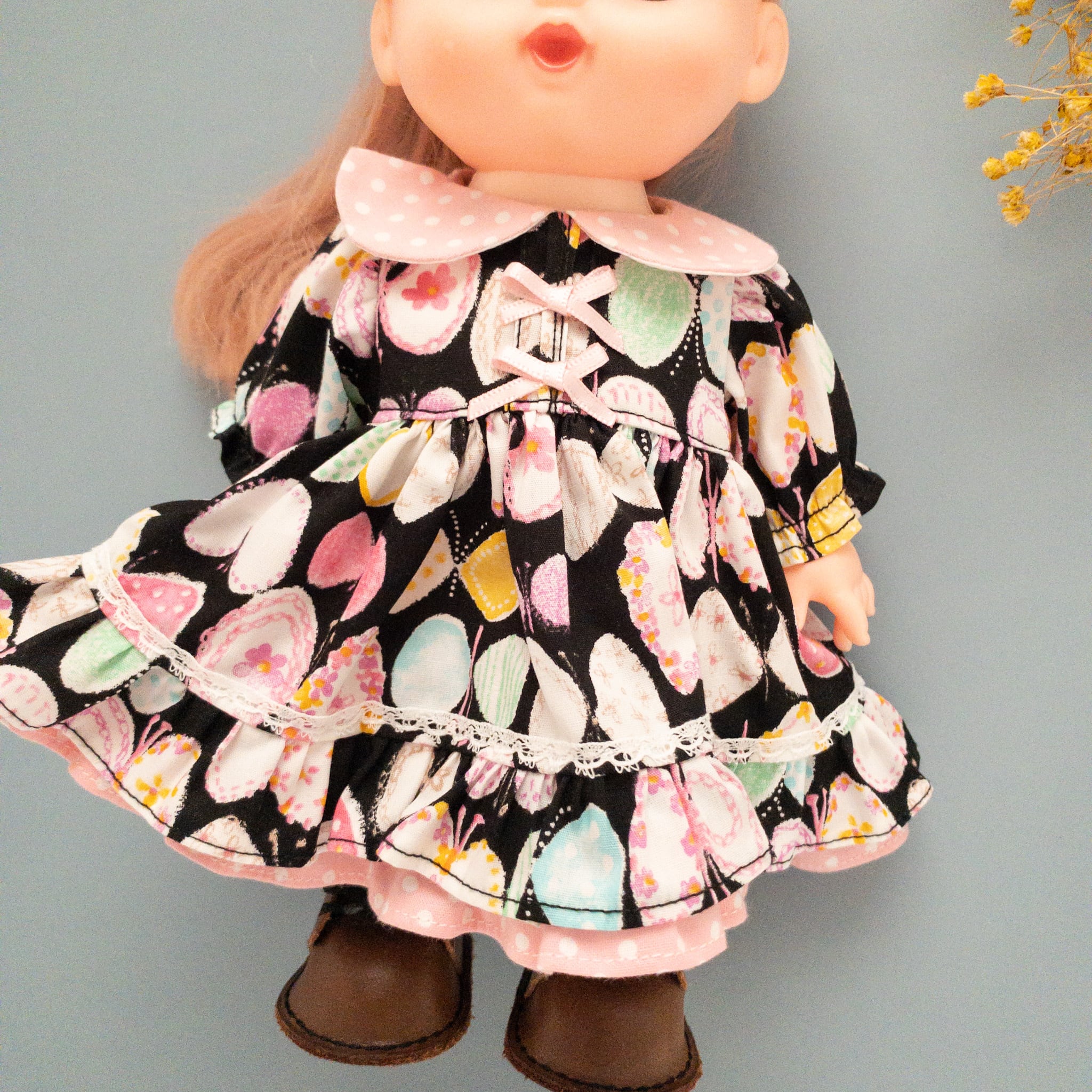 こちらメルちゃんやソランちゃんサイズのワンピースです。