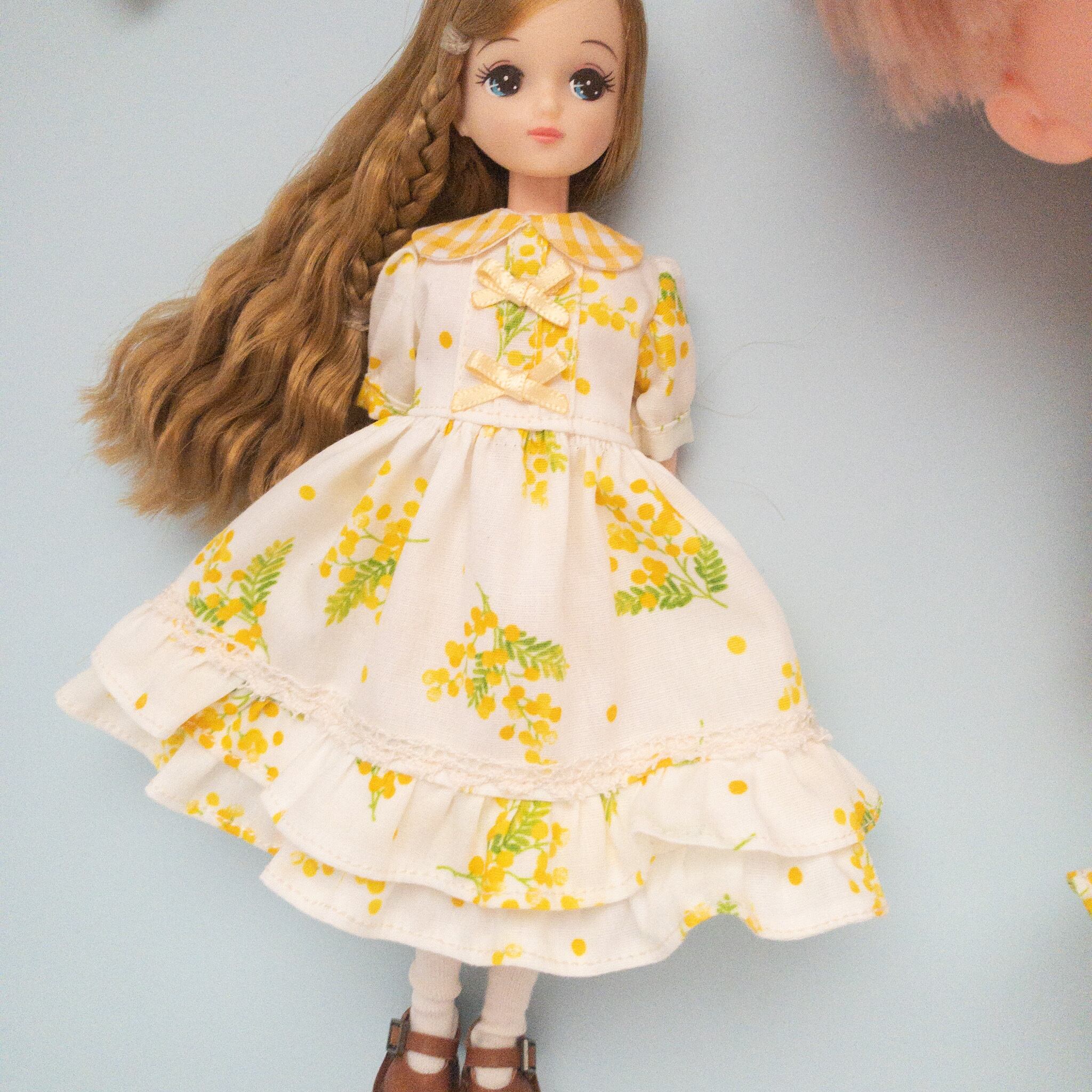 【2点セット】リカちゃんメルちゃんお揃いワンピース(白ミモザ黄チェック)